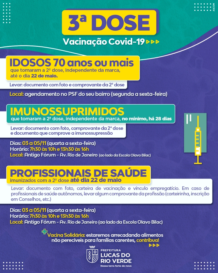 A Secretaria de Saúde de Lucas do Rio Verde informa o cronograma da próxima semana para aplicação de TERCEIRA DOSE da vacina contra a Covid-19. Confira:
