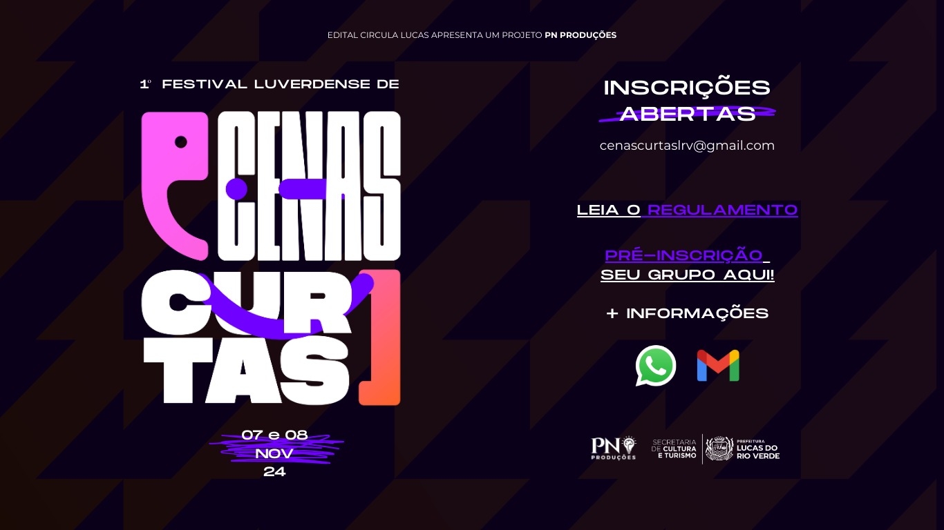 A Secretaria de Cultura e Turismo de Lucas do Rio Verde convida os artistas do município para participarem do 1° Festival Luverdense de Cenas Curtas. O evento visa incentivar o crescimento da cultura teatral na comunidade, tornando-se um marco na cena cultural local, descobrindo novos talentos.