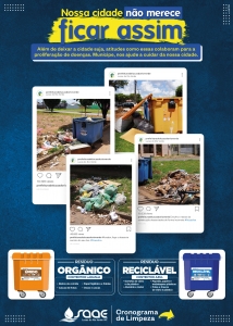 De um lado, imagens das formas irregulares de jogar o lixo que já foram encontradas na cidade, deixando o município feio e poluído. O informativo traz ainda um descritivo sobre os materiais orgânicos e recicláveis e o que deve ser descartado dentro de cada contentor.