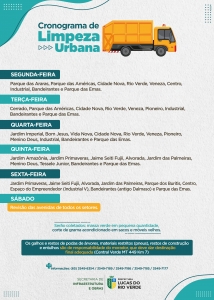 No verso do orientativo há o cronograma de limpeza urbana, organizado pela Secretaria de Infraestrutura e Obras e executado por terceirizadas em todos os bairros da cidade recolhendo resíduos maiores, que não são levados na coleta seletiva, como massa verde em pequena quantidade, corte de grama armazenado em sacos e também móveis velhos.