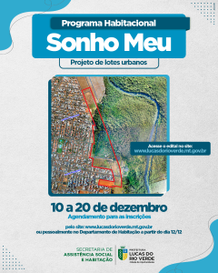 O edital do Programa Habitacional Sonho Meu, de lotes urbanos, foi publicado pela Prefeitura de Lucas do Rio Verde, na manhã desta quinta-feira (1º). O projeto é voltado às pessoas com renda familiar de R$ 1.500 a R$ 4.000. O período de agendamento das inscrições será de 10 a 20 de dezembro de 2022.