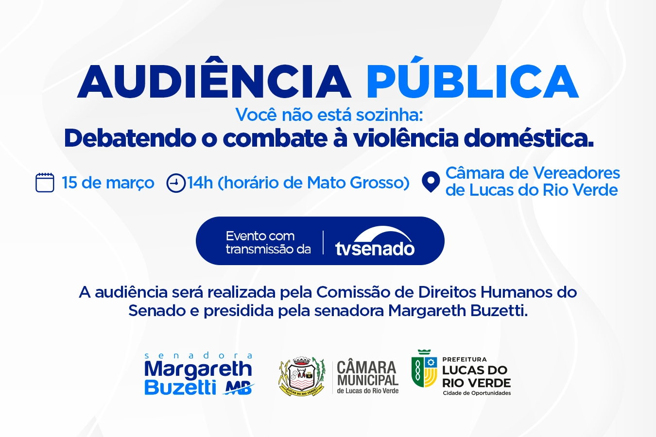 “Você não está sozinha. Debatendo o combate à violência doméstica”. Esse é o tema que será amplamente debatido no dia 15 de março, às 14h (horário de MT), no auditório da Câmara Municipal de Lucas do Rio Verde. A audiência pública será realizada pela Comissão de Direitos Humanos e Legislação Participativa do Senado, em parceria com a Prefeitura de Lucas do Rio Verde e Câmara de Municipal. O evento foi idealizado pela primeira-dama e secretária municipal de Assistência Social e Habitação, Janice Ribeiro, pela senadora Margareth Buzetti e pela presidente da Câmara, vereadora Sandra Barzotto.