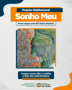 Nesta sexta-feira (14), a Prefeitura de Lucas do Rio Verde divulga lista dos selecionados do Projeto Habitacional Sonho Meu, que pertence ao Programa Habitacional Ser Luverdense Habitação, da segunda etapa que possui 180 lotes urbanos voltados às pessoas com renda familiar de R$ R$ 2.640,01 a R$ 4.400,00.