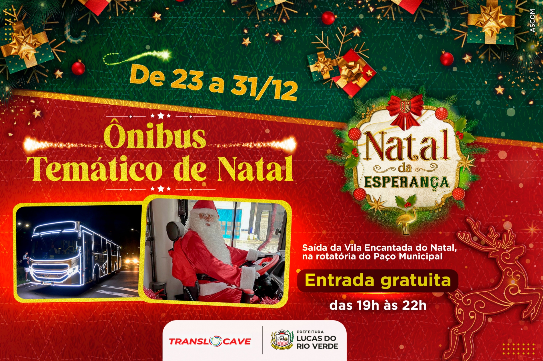 A partir desta segunda-feira (23), até o dia 31de dezembro, um ônibus temático de natal integrará a programação do Natal da Esperança da Prefeitura de Lucas do Rio Verde. O passeio é gratuito e passará por alguns pontos da cidade, com saída e chegada na Vila Encantada.
