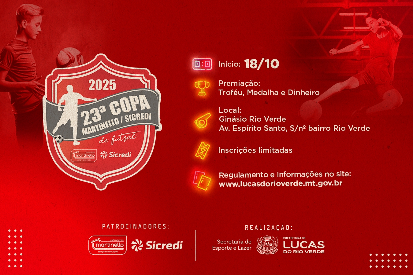 As inscrições para a 23ª Copa Martinello/Sicredi de Futsal 2025 já estão abertas e seguem até o dia 13 de outubro. A competição, uma das mais tradicionais do esporte em Lucas do Rio Verde, terá início no dia 18 de outubro, com jogos no Ginásio Rio Verde, localizado no bairro Rio Verde e Ginásio Pimpão, no bairro Menino Deus.