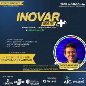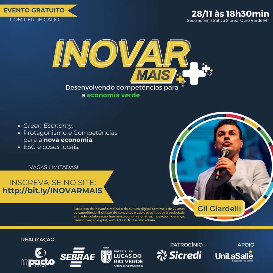 Com objetivo de disseminar conhecimento sobre o conceito de economia verde, a segunda edição do Inovar Mais em Lucas do Rio Verde será realizada na próxima terça-feira, 28 de novembro, às 18h30. O evento é gratuito, com certificado ao final, tendo na programação palestra com os especialistas Gil Giardelli e Douglas Souza.