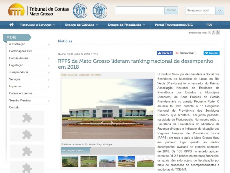 O Instituto Municipal de Previdência Social dos Servidores do Município de Lucas do Rio Verde (Previlucas) foi o vencedor do Prêmio Associação Nacional de Entidades de Previdência dos Estados e Municípios (Aneprem) de Boas Práticas de Gestão Previdenciária no quesito Pequeno Porte. O anúncio foi feito durante o 1º Congresso Nacional de Previdência dos Servidores Públicos, que aconteceu em junho passado, na cidade de Florianópolis. No mesmo mês, a Secretaria de Previdência do Ministério da Fazenda divulgou o indicador da situação dos Regimes Próprios de Previdência Social (RPPS) em todo o país e Mato Grosso ficou em primeiro lugar quanto ao melhor desempenho, avaliado no primeiro semestre de 2018. Os 105 RPPS no estado aplicam cerca de R$ 2,5 bilhões no mercado financeiro, os quais têm sido objeto de fiscalização por meio de processos de acompanhamentos e auditorias do TCE-MT.
