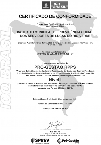 O Município de Lucas do Rio Verde, por meio do Instituto Municipal de Previdência Social dos Servidores de Lucas do Rio Verde (Previlucas), é o primeiro município do Brasil a conquistar certificação no Programa Pró-Gestão RPPS, da Secretaria de Previdência Social – Ministério da Fazenda.
