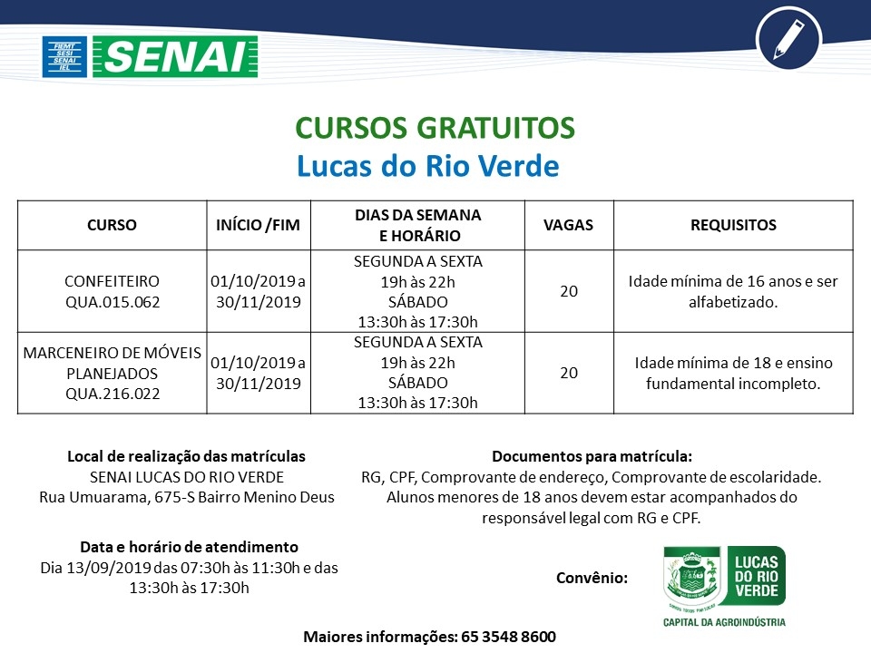 A Prefeitura de Lucas do Rio Verde e o Serviço Nacional de Aprendizagem Industrial (Senai) estão ofertando dois cursos gratuitos. Serão realizado os cursos de confeiteiro e de marceneiro de móveis planejados.