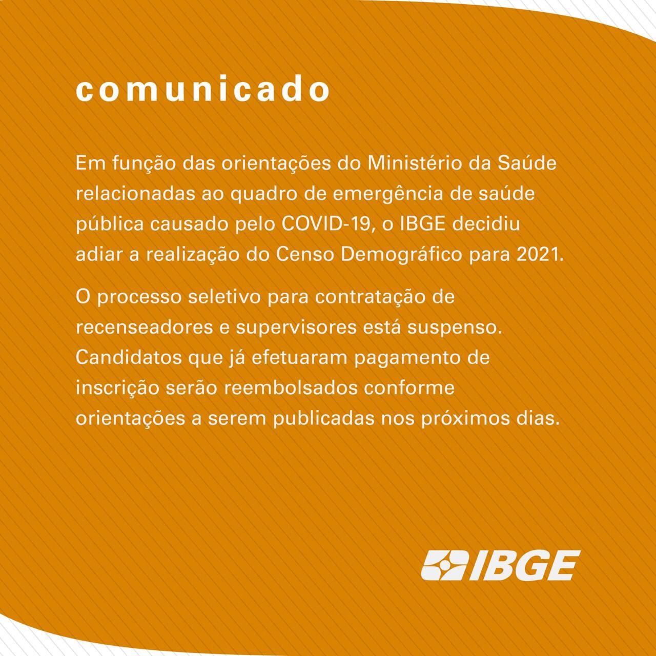 O processo seletivo para contratação de recenseadores e supervisores está suspenso. Candidatos que já efetuaram pagamento de inscrição serão reembolsados conforme orientações a serem publicadas nos próximos dias.