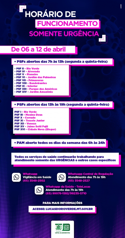 A Prefeitura de Lucas do Rio Verde informa que na próxima semana as unidades de saúde terão atendimento diferenciado. Para os casos de urgência, alguns PSFs abrirão de manhã e outros à tarde, e o Pronto Atendimento Municipal (PAM) em horário habitual.