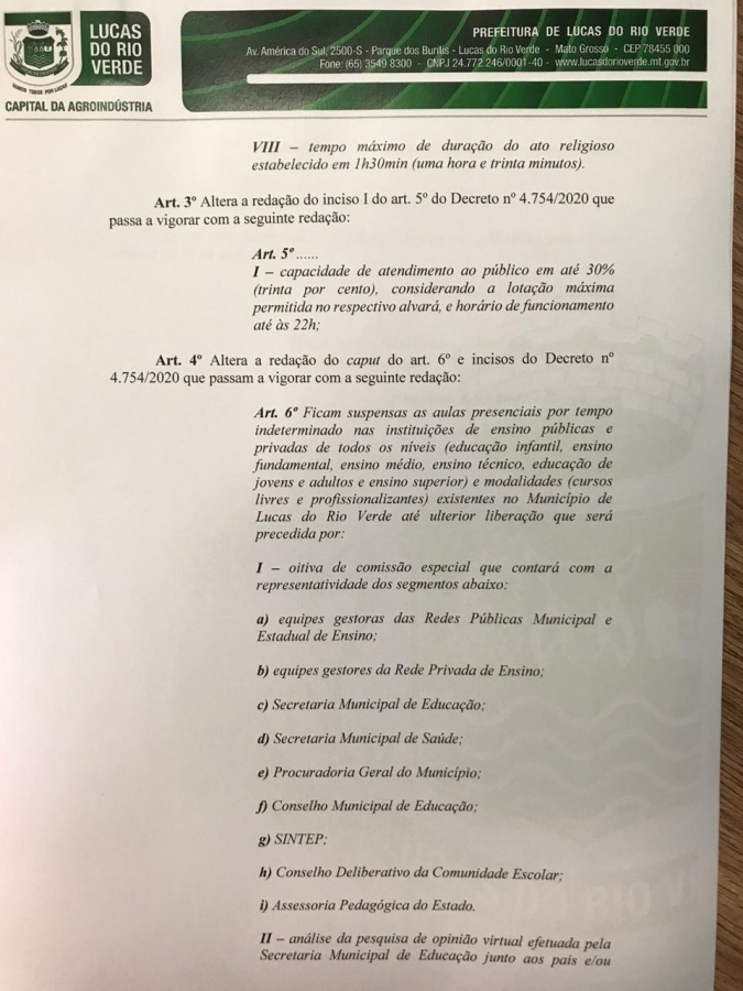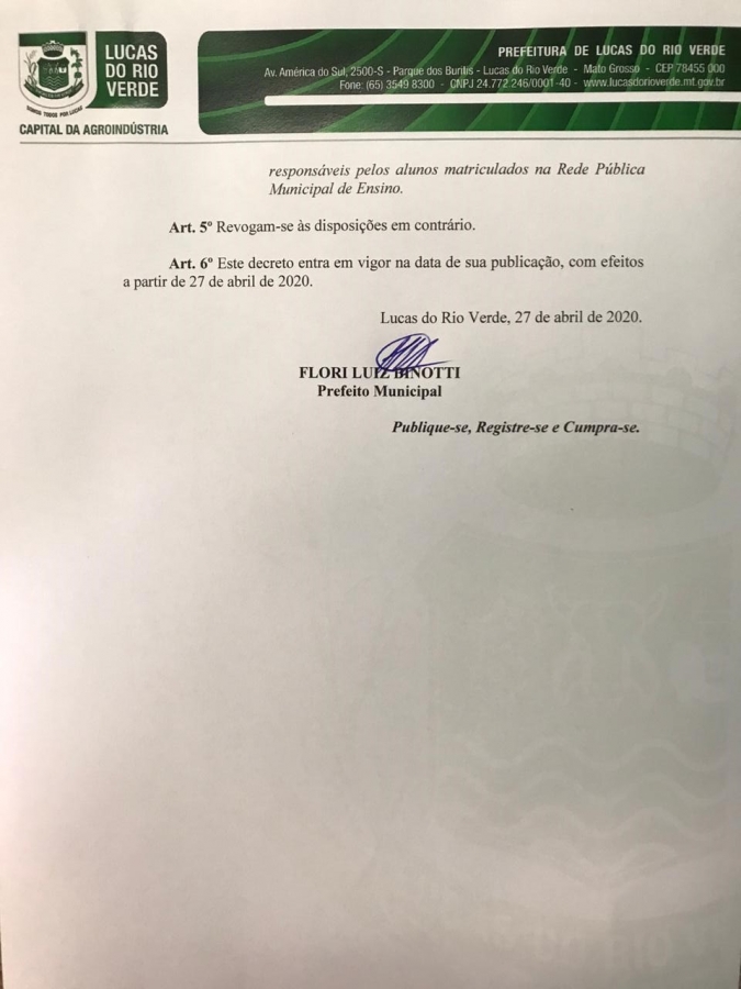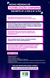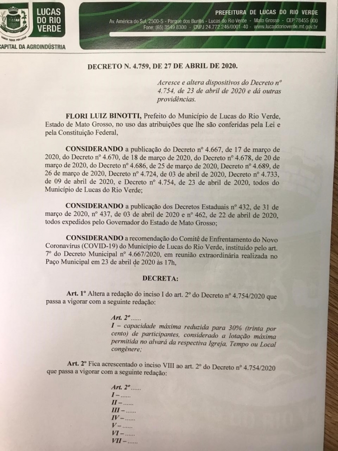 O prefeito de Lucas do Rio Verde, Luiz Binotti, assinou os Decretos Municipais nº 4.754/2020 e nº 4.759/2020, que estabelecem a liberação parcial e condicionada de celebrações religiosas, parques públicos e bares. As atividades estavam suspensas devido à pandemia do Novo Coronavírus (COVID-19).