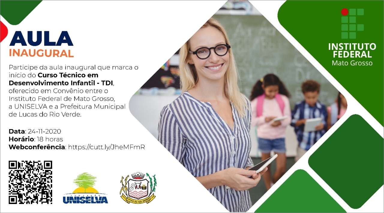 Os alunos inscritos no Curso Técnico em Desenvolvimento Infantil (TDI) terão aula inaugural via online a partir das 18 horas desta terça-feira, 24. O curso será oferecido gratuitamente por meio de convênio entre o Instituto Federal de Mato Grosso (IFMT), a Fundação Uniselva, ligada à Universidade Federal de Mato Grosso (UFMT), e a Prefeitura de Lucas do Rio Verde, por intermédio da Secretaria Municipal de Educação.