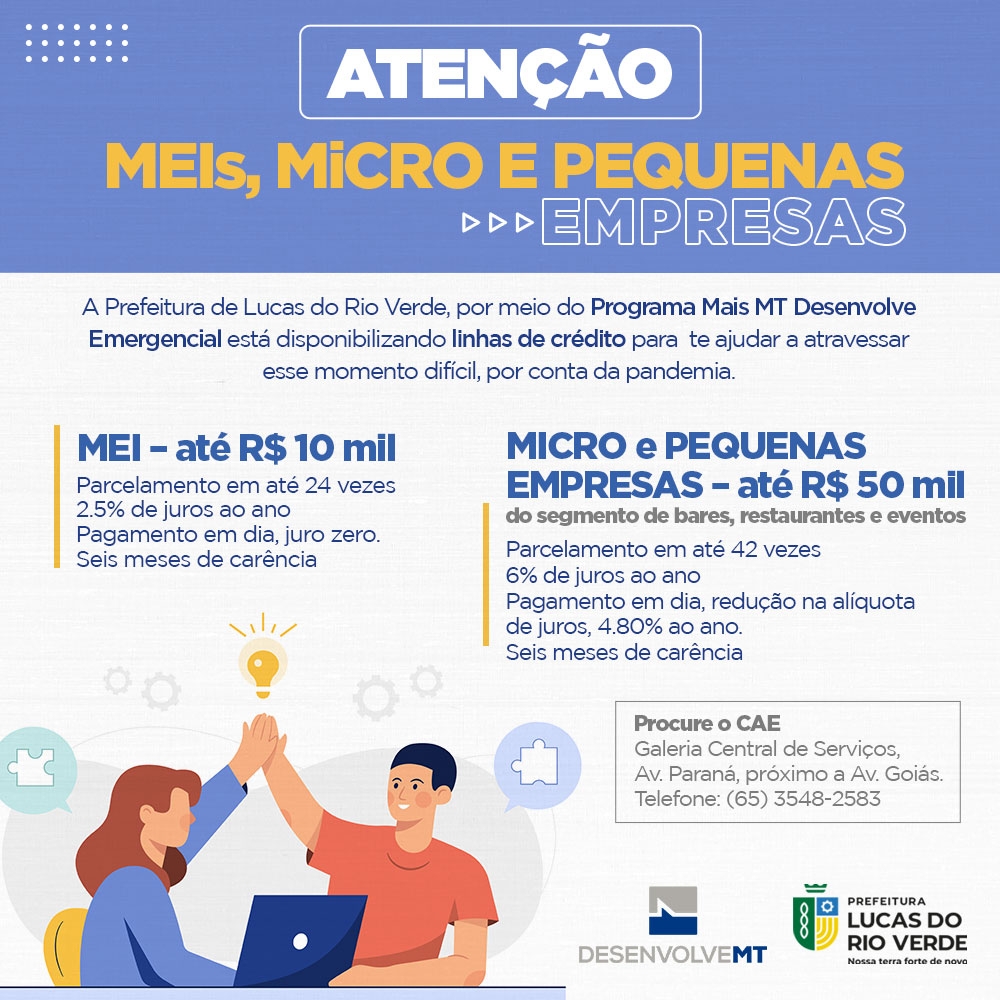 A Prefeitura de Lucas do Rio Verde, por meio do Programa Mais MT - Desenvolve Emergencial, está disponibilizando linhas de crédito para auxiliar MEIs e micro e pequenas empresas do segmento de bares, restaurantes e ligadas ao setor de eventos a buscar alternativas e minimizar os impactos da crise por conta da pandemia.
