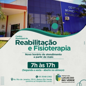 A Secretaria Municipal de Saúde informa que, a partir de maio, o Centro Municipal de Reabilitação e Fisioterapia Dom Aquino Correa passa a funcionar em horário integral, das 7h às 17h, sem intervalo para almoço.