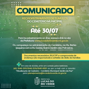 O recadastramento de túmulos no Cemitério Municipal Jardim da Paz, em Lucas do Rio Verde, continua sendo realizado on-line ou de forma presencial, por meio da Secretaria Municipal de Planejamento e Cidade.