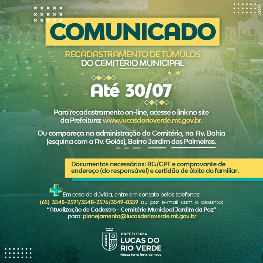 Para renovar o cadastro é preciso levar RG, CPF, comprovante de residência (do responsável) e certidão de óbito do falecido. Já aqueles que preferirem fazer isso de forma virtual, podem acessar o recadastramento pelo site da prefeitura: https://www.lucasdorioverde.mt.gov.br. O serviço é totalmente gratuito, e ficará disponível até o próximo dia 30 de julho.