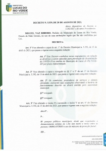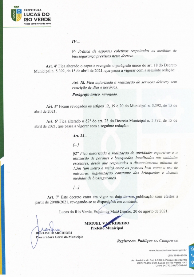 A Prefeitura de Lucas do Rio Verde publicou, nesta sexta-feira (20), o Decreto Municipal nº 5.539/2021, que altera dispositivos do Decreto nº 5.392. As novas medidas levam em conta a avaliação de indicadores do cenário epidemiológico, com a redução no percentual de ocupação de leitos de enfermaria e UTI do Estado, além do avanço na vacinação contra a Covid-19.