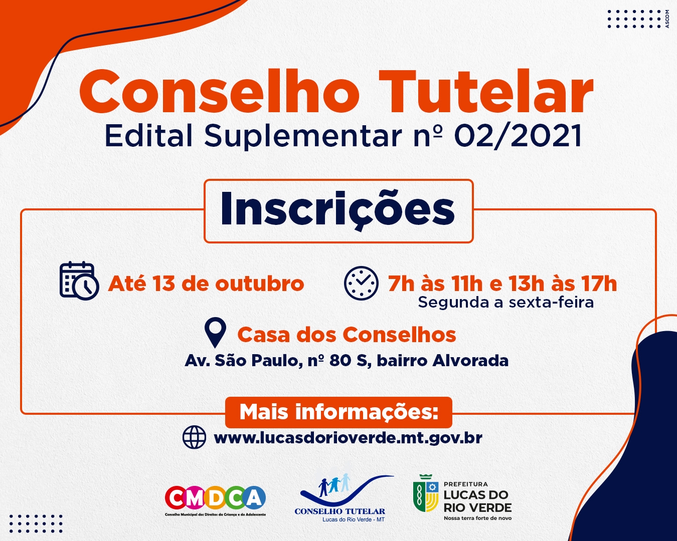 A partir desta terça-feira (21) as inscrições para o edital suplementar do Conselho Tutelar estão abertas. O processo prevê a seleção de um novo conselheiro titular e outros suplentes. O processo está sendo organizado pelo Conselho Municipal dos Direitos da Criança e do Adolescente (CMDCA), com apoio da Prefeitura de Lucas do Rio Verde.