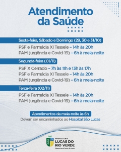A Prefeitura de Lucas do Rio Verde informa que não haverá atendimento ao público na sexta-feira, dia 29/10, e segunda e terça-feira (01 e 02/11) no Paço Municipal e outras unidades públicas.
