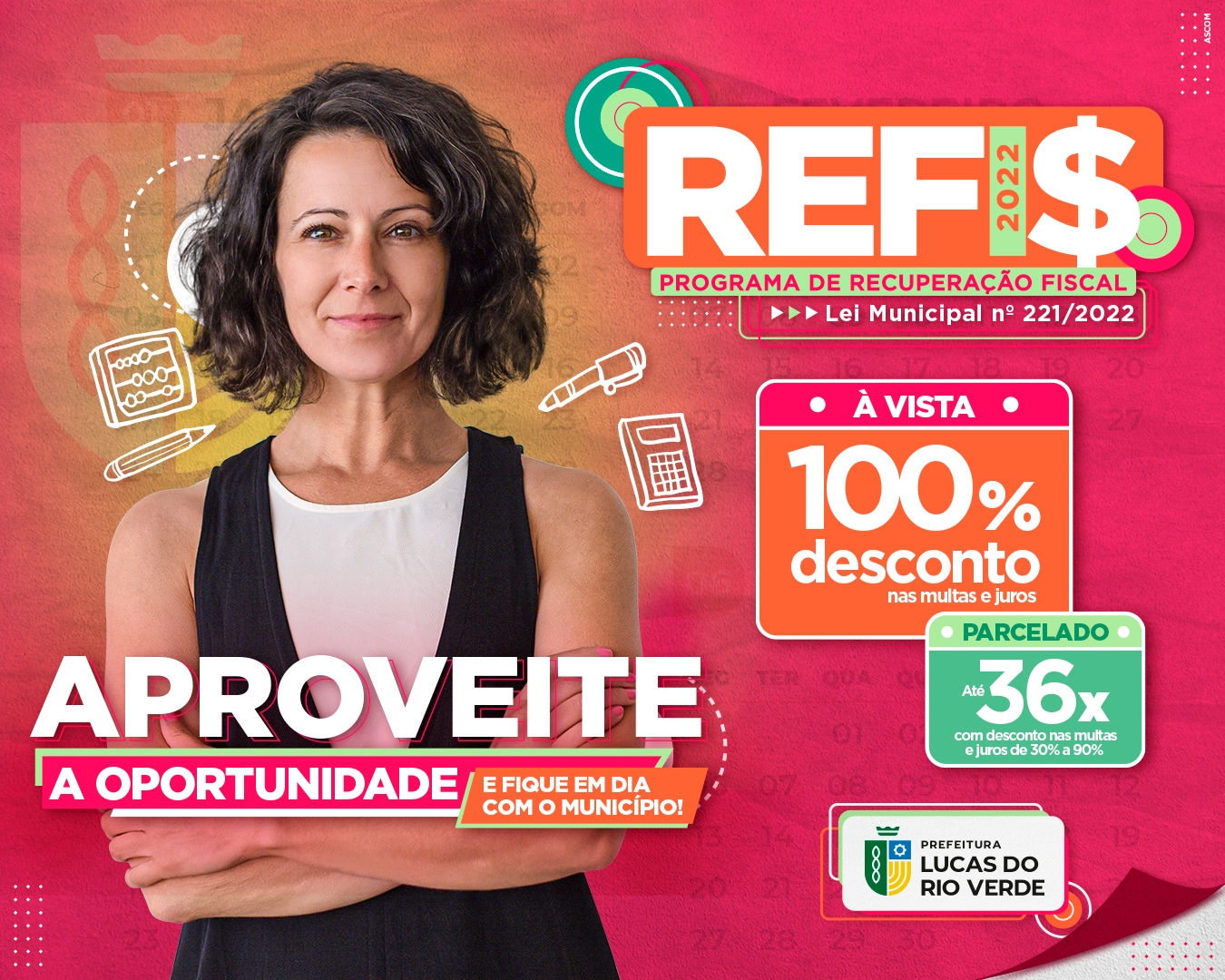 O Programa de Recuperação Fiscal – Refis 2022 – já começou e vai até o dia 20 de dezembro de 2022. O objetivo é facilitar a regularização dos débitos vencidos que os contribuintes têm com o Município, por meio de incentivos, como a isenção de multas e juros.