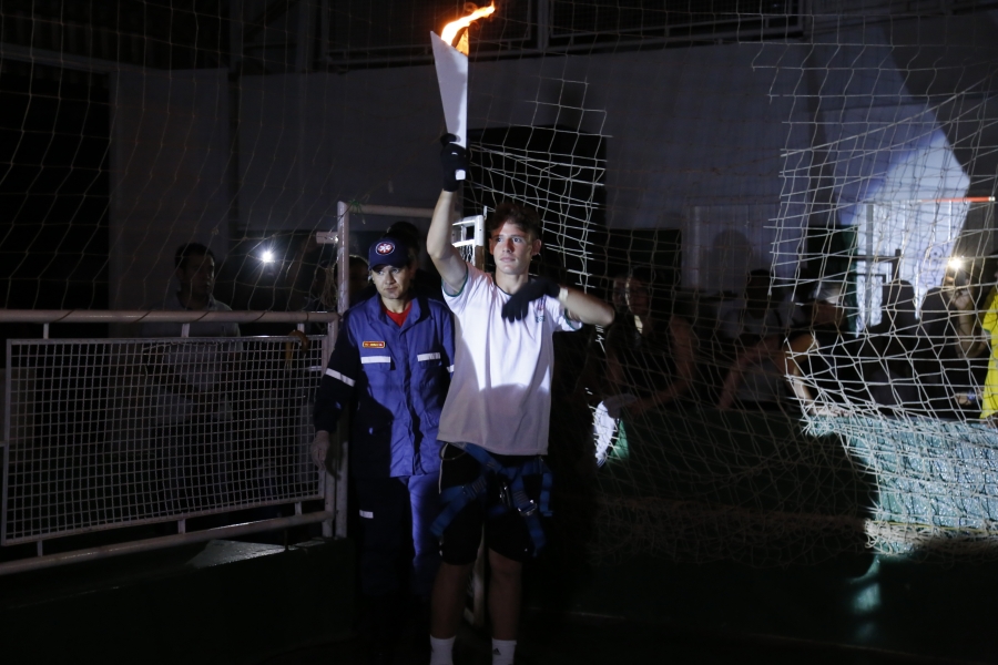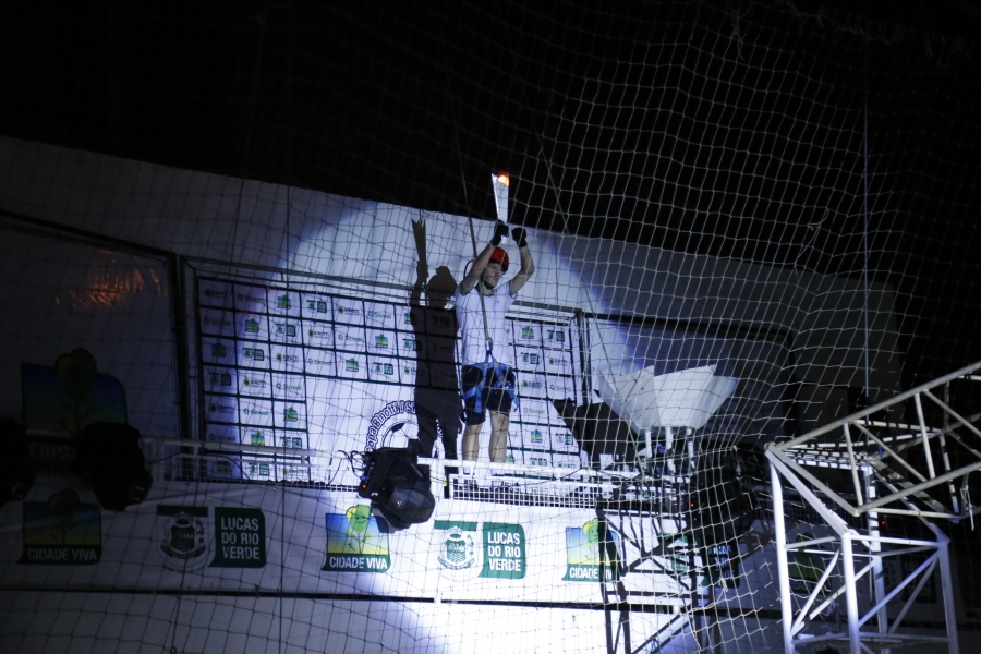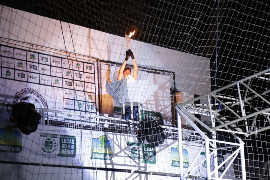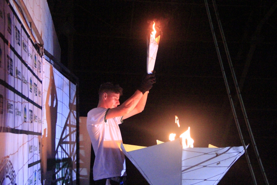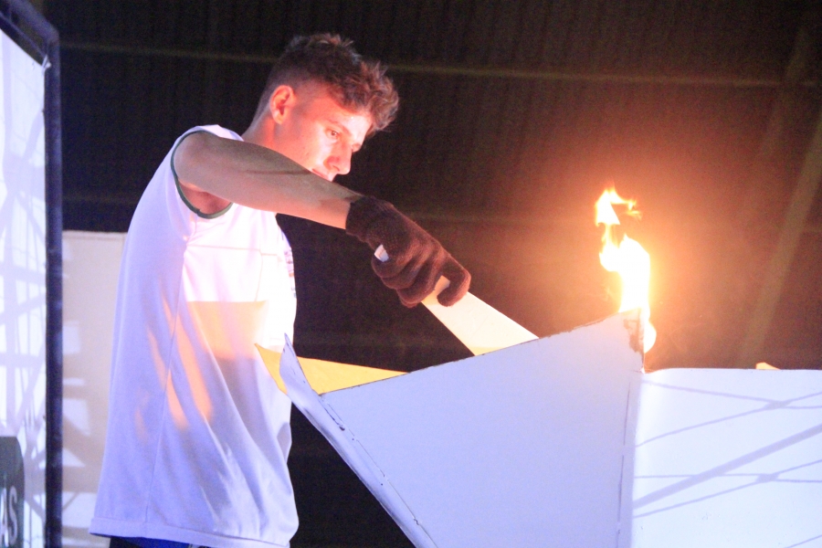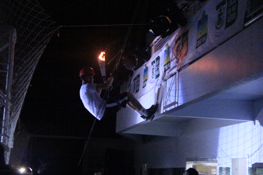 Para acender a pira olímpica, o atleta Felipe Bianchessi, da Escola Municipal Olavo Bilac, desceu de rapel com a tocha e levou o público e os atletas ao delírio. A criançada também se divertiu muito, com os balões que foram soltos no meio da quadra.