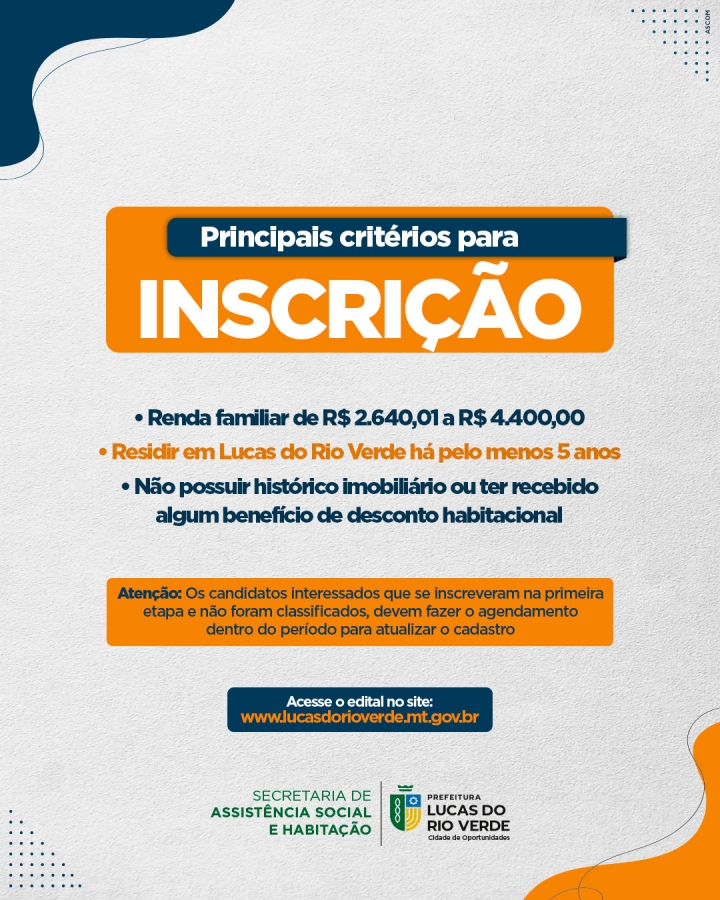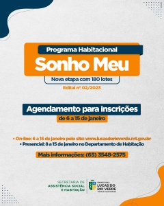 O link segue até às 23h59 do prazo limite. O agendamento da inscrição está disponível no Portal da Habitação, no site da Prefeitura, por meio deste link: https://habitacao.lucasdorioverde.mt.gov.br/portal/agendamento?action=form&id=4
