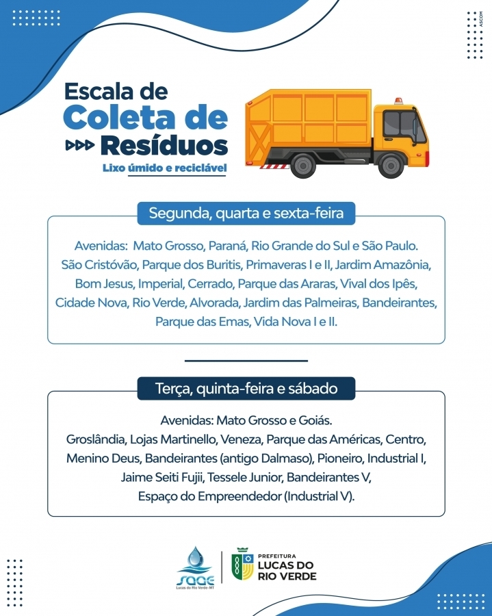 Nos contentores de cor azul podem ser dispensados resíduos secos, como plásticos, papéis, vidros e metais. Já nos da cor laranja, apenas úmidos, como restos de alimentos e lixo de banheiro. Com o método de coleta, além de promover a limpeza da cidade, Lucas do Rio Verde, contribui para a preservação do meio ambiente.