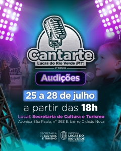 Chegou a hora dos candidatos do Cantarte 2023 mostrarem o seu talento nas audições. A etapa classificatória para a grande final será realizada nos dias 25, 26, 27 e 28 de julho, na sede da Secretaria de Cultura e Turismo, a partir das 18h.