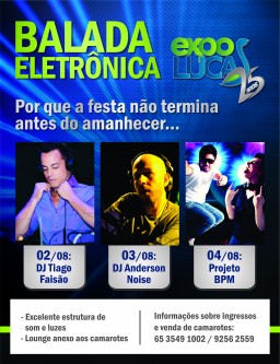 Adilson Marcondes, responsável pela sonorização e iluminação, lembra que a música eletrônica já fazia parte das atrações da Expolucas, mas neste ano serão muitas as inovações. “A balada de house e eletro music será em um local reservado, para acomodar muito bem o público. O lounge contará com uma mega estrutura de som e luzes voltadas para o palco e para a plateia. Vamos utilizar a mesma quantidade de aparelhagem de som e luz que é utilizada em grandes shows nacionais”, destaca.