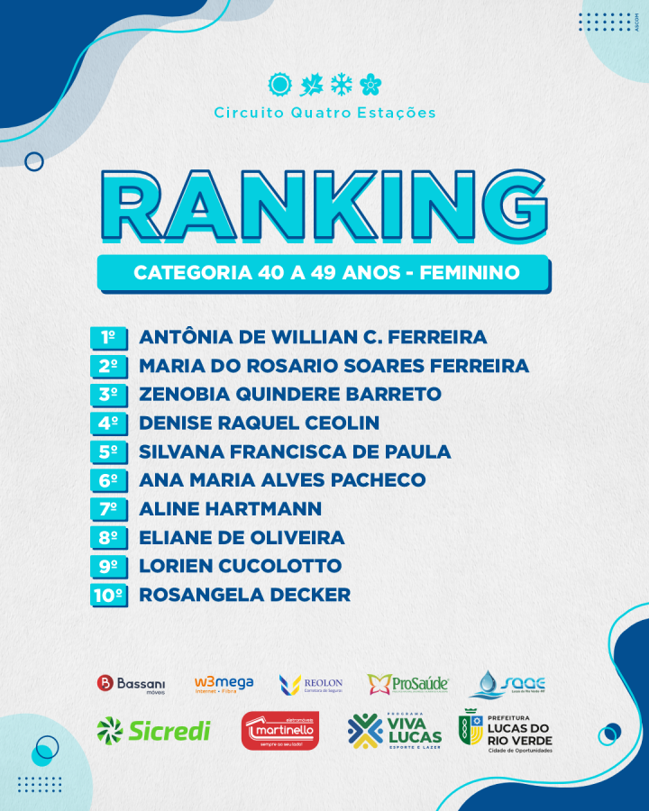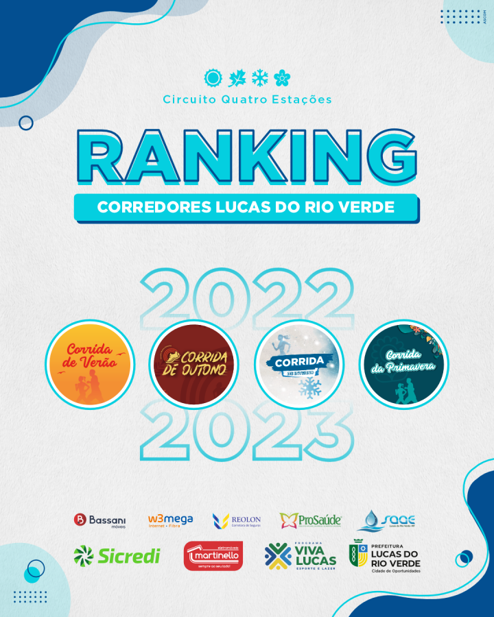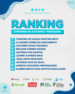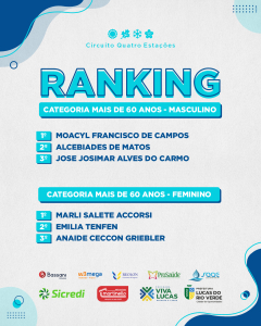 A partir do resultado em cada etapa do Circuito Quatro Estações, ao longo de 2022, a Secretaria de Esporte e Lazer definiu o ranking municipal dos atletas de Lucas do Rio Verde. Com base nessa classificação, os competidores melhores colocados terão apoio da Prefeitura em provas fora da cidade.