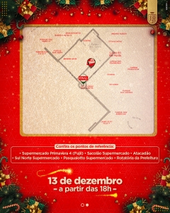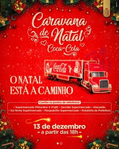 Nesta quarta-feira (13), o município receberá mais uma edição da Caravana de Natal da Coca-Cola. A saída será às 18h, do Depósito Solar, na Avenida São Paulo. Em seguida, a caravana passará pelo Supermercado Primavera 4 (Fujii), Sacolão Supermercado, Atacadão, Sul Norte Supermercado, Pasqualotto Supermercado, finalizando a atividade na Rotatória da Prefeitura.