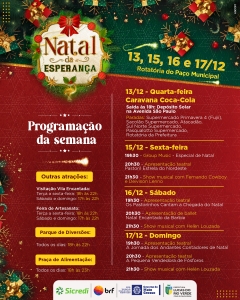 Já as apresentações culturais acontecem no palco do Natal da Esperança de sexta a domingo, a partir das 19h30, até o dia 23 de dezembro.