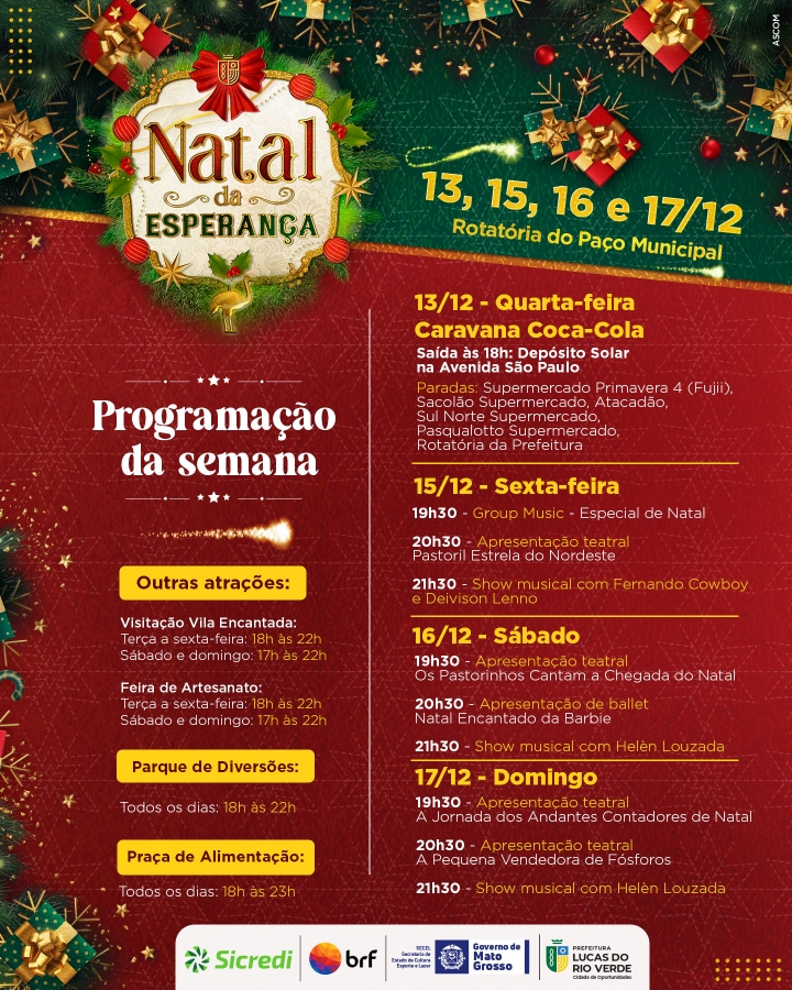 As atividades natalinas continuam acontecendo em Lucas do Rio Verde. O Natal da Esperança, que conta este ano com o patrocínio das empresas BRF, Sicredi Ouro Verde e Governo do Estado de Mato Grosso, vai até o dia 30 de dezembro, na rotatória do Paço Municipal.