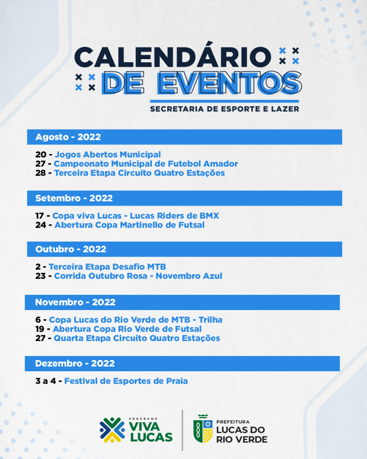 A Secretaria de Esporte e Lazer de Lucas do Rio Verde divulgou calendário esportivo para abril até dezembro deste ano. Em abril, serão seis eventos realizados e em maio, cinco.