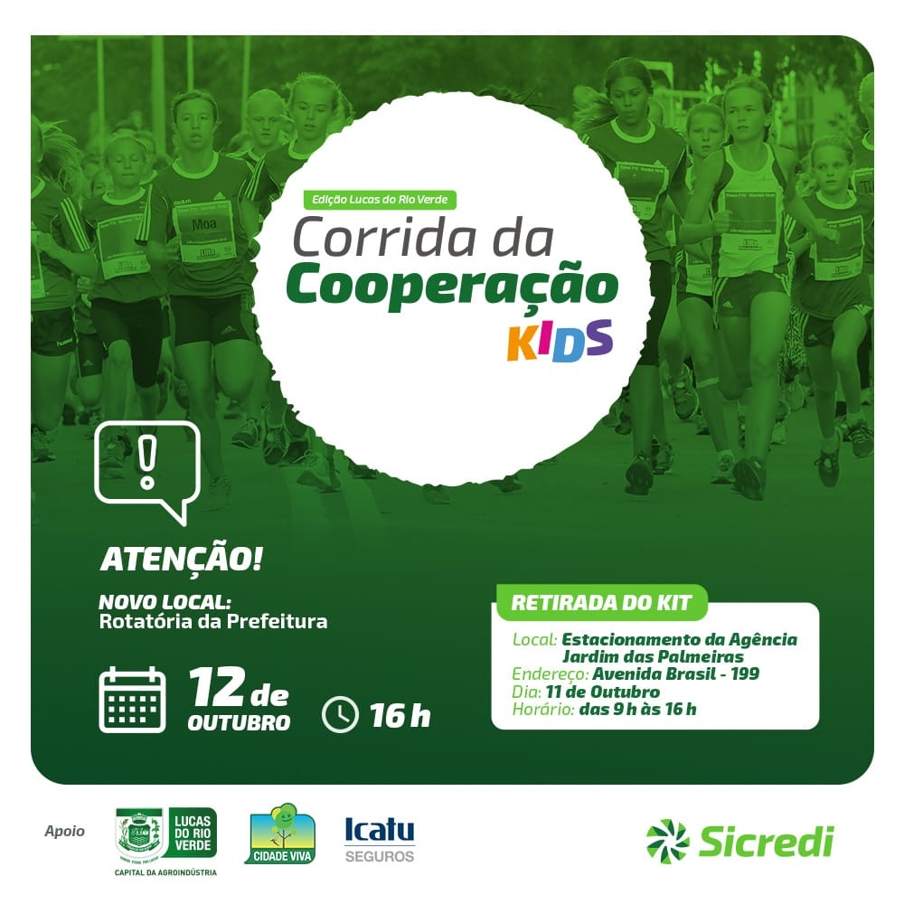 A 1ª Corrida da Cooperação – Edição Kids mudou de local. O evento, promovido pela Sicredi Ouro Verde MT, com o apoio da Prefeitura de Lucas do Rio Verde, por meio da Secretaria de Esporte e Lazer, será realizado no dia 12 de outubro, às 16h, na rotatória da prefeitura.