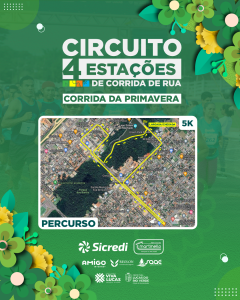 Com largada marcada para 6h30, no estacionamento do Lago Ernani José Machado, o domingo (3) será marcado pela última etapa do Circuito Quatro Estações de Corrida de Rua, a Corrida da Primavera. Os kits contendo camiseta e chip de cronometragem deverão ser retirados no sábado (2), das 15h às 17h, no local da prova.