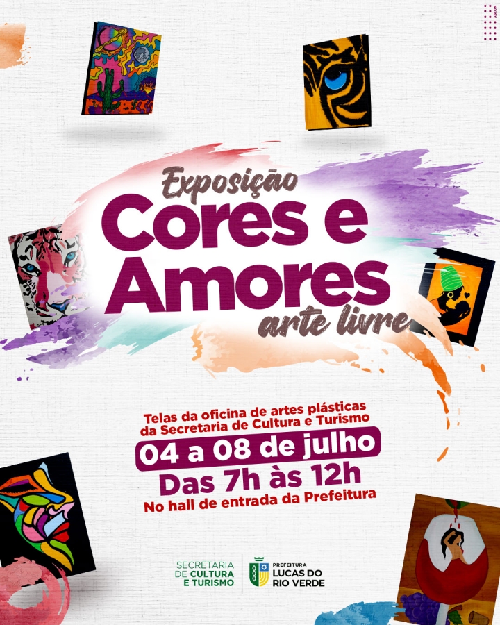 Com o objetivo de divulgar os trabalhos realizados na oficina de artes plásticas, a Secretaria de Cultura e Turismo de Lucas do Rio Verde convida a população para conferir a exposição “Cores e Amores - Arte Livre”. Cerca de 40 telas e quadros produzidos pelos alunos da oficina serão expostas do dia 04 a 08 de julho, no hall de entrada da Prefeitura.