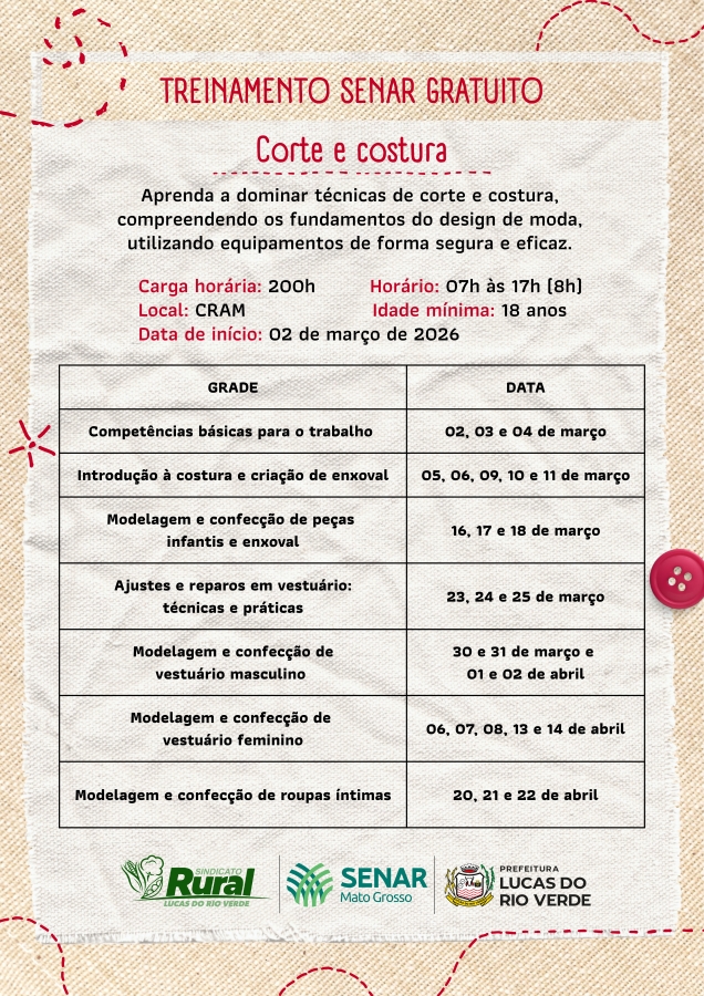 A capacitação será ministrada pelo Senar-MT, responsável pela oferta do treinamento. Durante as aulas, os participantes aprenderão técnicas de corte e costura, noções de modelagem e confecção de diferentes peças do vestuário. A proposta é preparar os alunos tanto para o mercado de trabalho, quanto para quem deseja empreender e gerar renda própria.