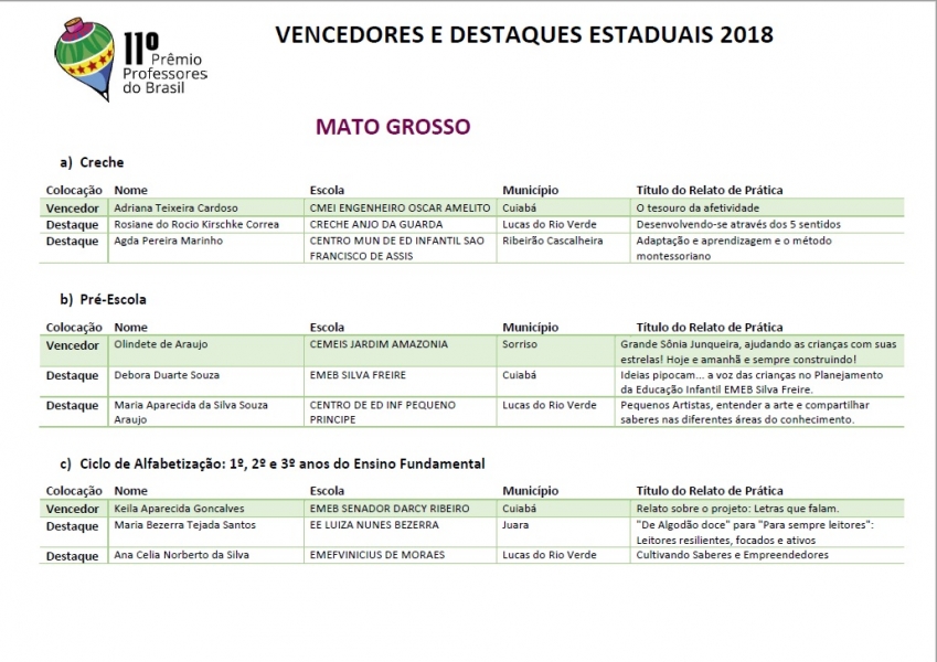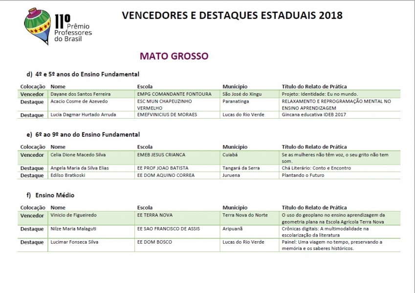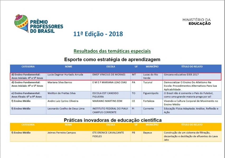 Os resultados estão disponíveis em: http://premioprofessoresdobrasil.mec.gov.br/#apresentacao.