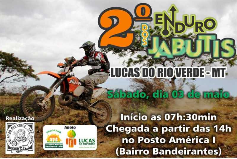 A Prefeitura de Lucas do Rio Verde, através da Secretaria de Esporte e Lazer e do Programa Vida Nova, juntamente com o Grupo de Trilheiros Jabuti do Cascaio, realiza neste sábado (03), mais uma etapa do Campeonato Mato-grossense de Enduro de Regularidade de moto trilha.