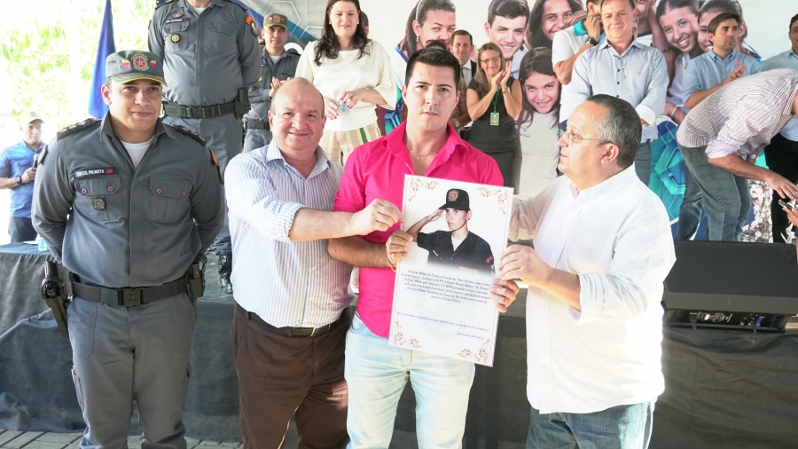 Soldado PM Adriana Morais Ramos foi a primeira policial mulher de Lucas do Rio Verde e foi representada pelo irmão, Fernando Ramos Oliveira, que recebeu uma placa em homenagem a militar.