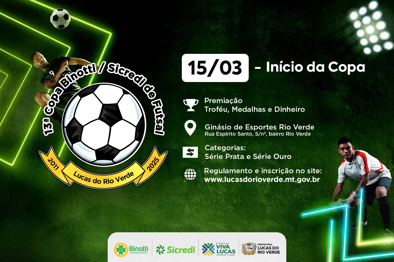 A 13ª Copa Municipal Binotti / Sicredi de Futsal 2025 é um evento da Prefeitura de Lucas do Rio Verde por meio da Secretaria Municipal de Esporte e Lazer e o patrocínio é das empresas Binotti Armazéns Gerais e Sicredi Ouro Verde.