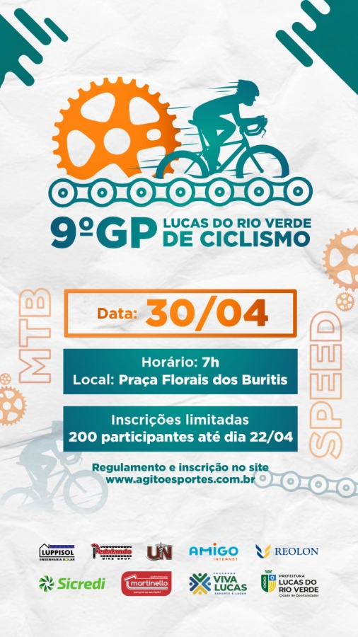 A Prefeitura de Lucas Rio Verde, por meio da Secretaria de Esporte e Lazer, lançou nesta quinta-feira (06), as inscrições para o 9º GP de Ciclismo. O evento será realizado no dia 30 de abril, nas imediações do Loteamento Parque dos Buritis.