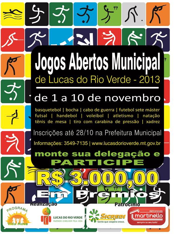 A Prefeitura de Lucas do Rio Verde, através da Secretaria de Esporte e Lazer, realiza a partir de 1º de novembro a 10ª edição dos Jogos Abertos do município. As delegações podem se inscrever gratuitamente até 28 de outubro, no Paço Municipal.