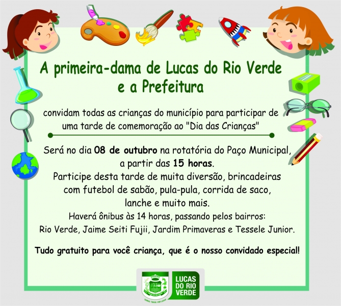 No próximo domingo, dia 08, a Prefeitura de Lucas do Rio Verde, juntamente com a primeira-dama Rafaela Frizzo, promoverá um evento especial em comemoração ao Dia das Crianças. O evento será realizado às 15h, no Paço Municipal.