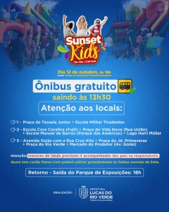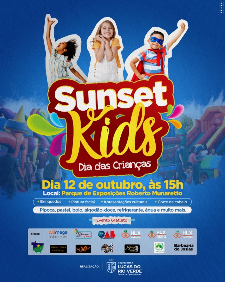 A Prefeitura de Lucas do Rio Verde convida a população luverdense para participar das comemorações ao Dia das Crianças. O evento Sunset Kids vai oferecer muita diversão para crianças de todas as idades e será realizado na próxima quarta-feira, dia 12 de outubro, a partir das 15h, no Parque de Exposições Roberto Munaretto.