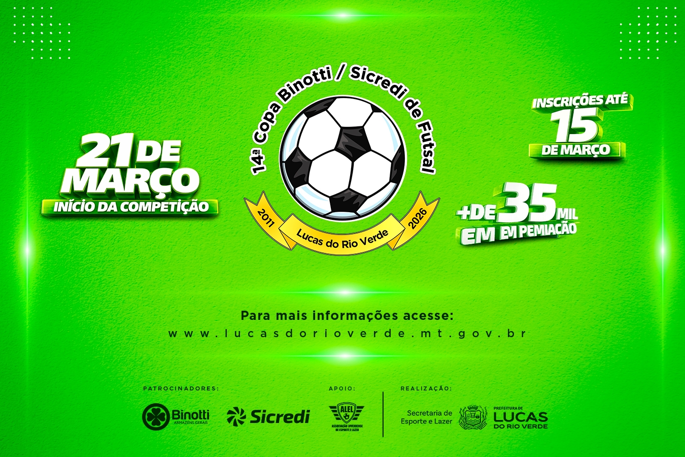 A 14ª Copa Binotti/Sicredi de Futsal terá início no dia 21 de março de 2026 no Ginásio Rio Verde, localizado no bairro Rio Verde, tendo suas rodadas de segunda a sexta-feira e finais de semana.