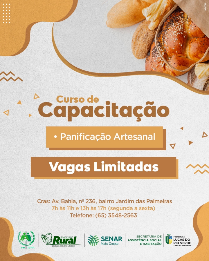 A Secretaria de Assistência Social e Habitação de Lucas do Rio Verde está com inscrições abertas para o curso de Panificação Artesanal. A capacitação será oferecida gratuitamente pela Prefeitura, Sindicato Rural e Senar-MT.