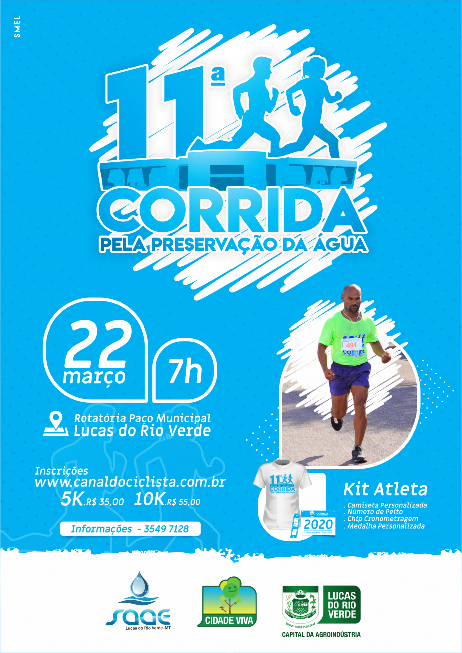 A 11ª Corrida pela Preservação da Água será realizada no dia 22 de março. A competição é organizada pela Prefeitura de Lucas do Rio Verde, por meio da Secretaria de Esporte e Lazer, e Serviço Autônomo de Água e Esgoto (Saae), e faz parte da programação da Semana da Água.